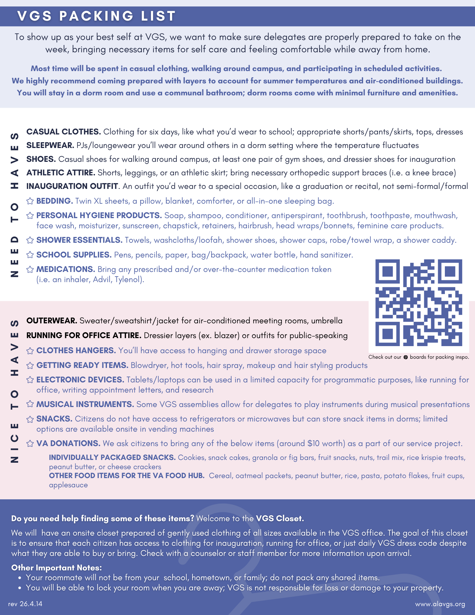 If you’ve been selected to attend the upcoming session of ALA Volunteer Girls State, congratulations! You’ll soon be a citizen of Volunteer Girls State. We’ve put together some information below to help you prepare for the week.